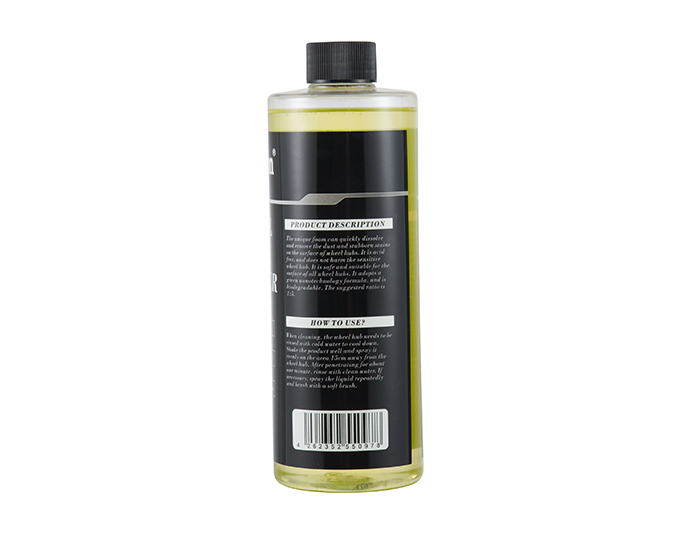 清洗时,轮毅需要用冷水冲洗降温,充分摇匀本品,距轮毅15cm将本品均匀喷于要清洁位置;渗透约一分钟后,用清水冲净;必要时反复喷施药液并用软刷刷洗。